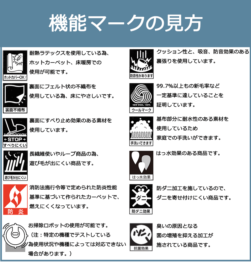 カーペットの基礎知識カーペット・絨毯(じゅうたん)には、お部屋の温度、湿度の調整や防音効果などがあります。