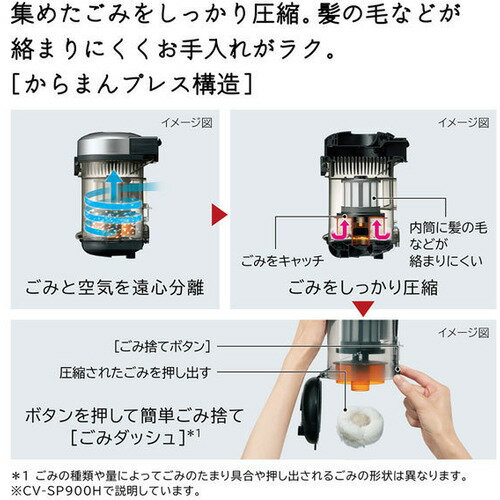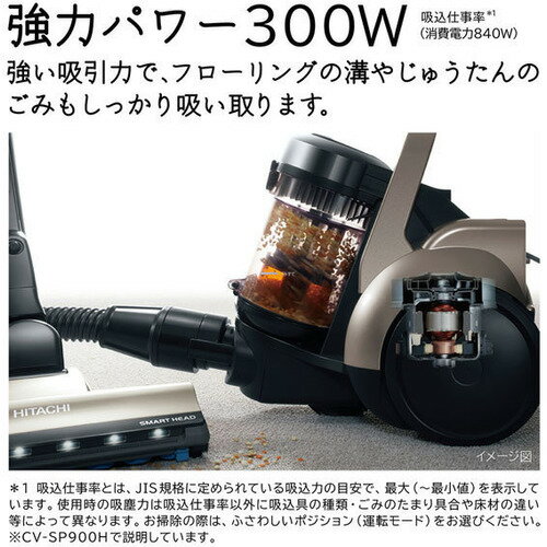 日立 CV-SP900H サイクロン式掃除機 パワかるサイクロン シャンパンゴールド発売日:2020年7月18日●きれいな排気微細なごみも99.999%逃がさない(※) ※0.3〜10マイクロメートルの大きさ●強い吸引力でしっかり吸い取る 吸込仕事率300W「高性能小型ファンモーター」が吸込仕事率300Wの強い吸引力を生み出し、フローリングの溝やじゅうたんのごみもしっかり吸い取ります。